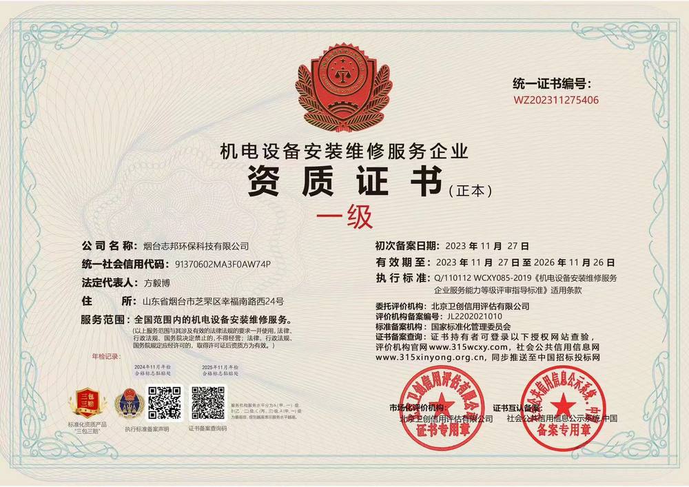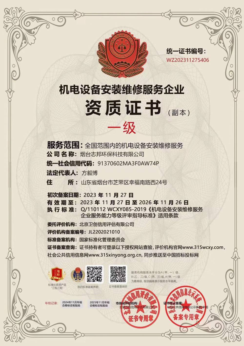 機(jī)電設(shè)備安裝維修服務(wù)企業(yè)資質(zhì)證書(shū) 一級(jí)